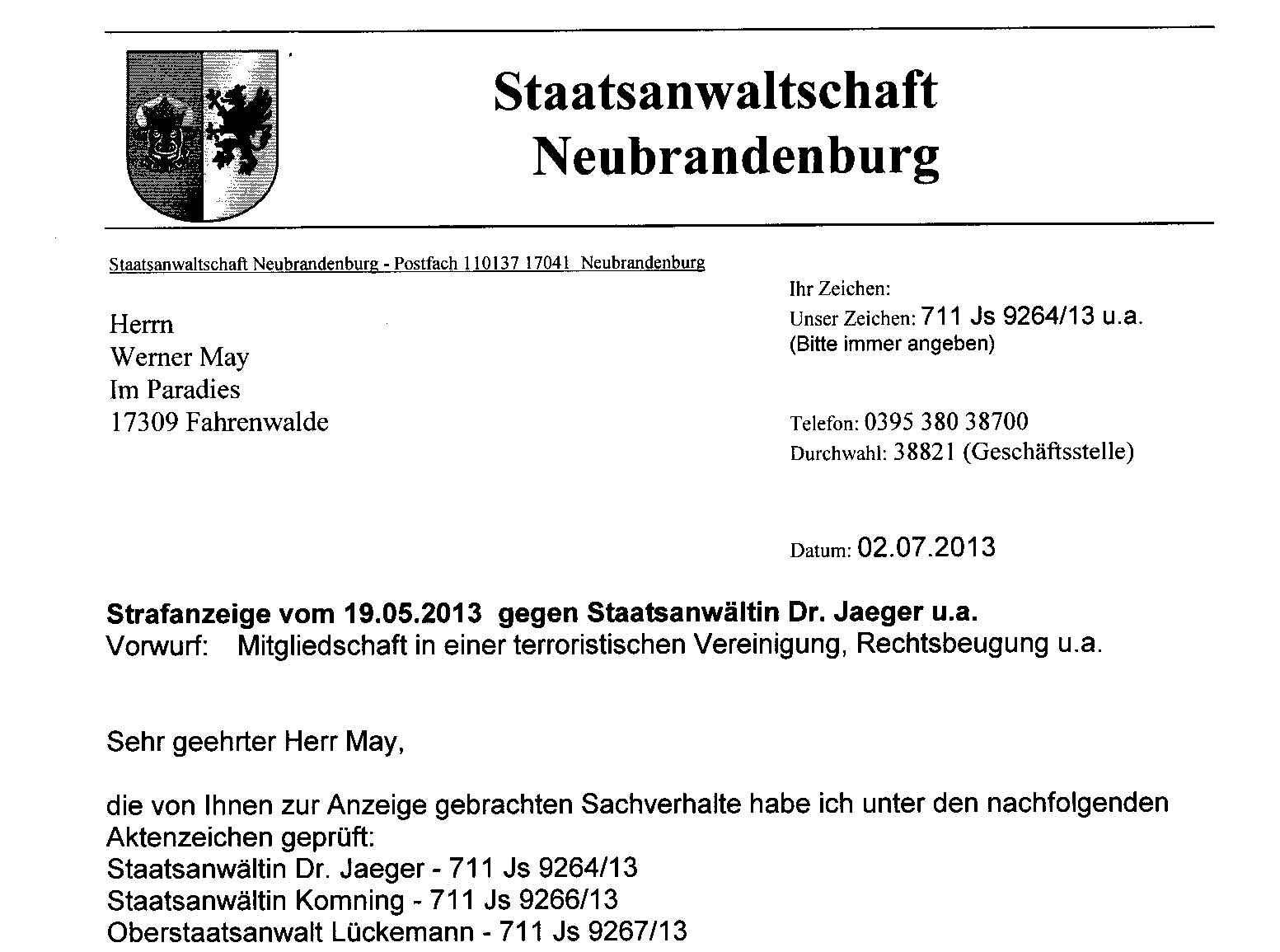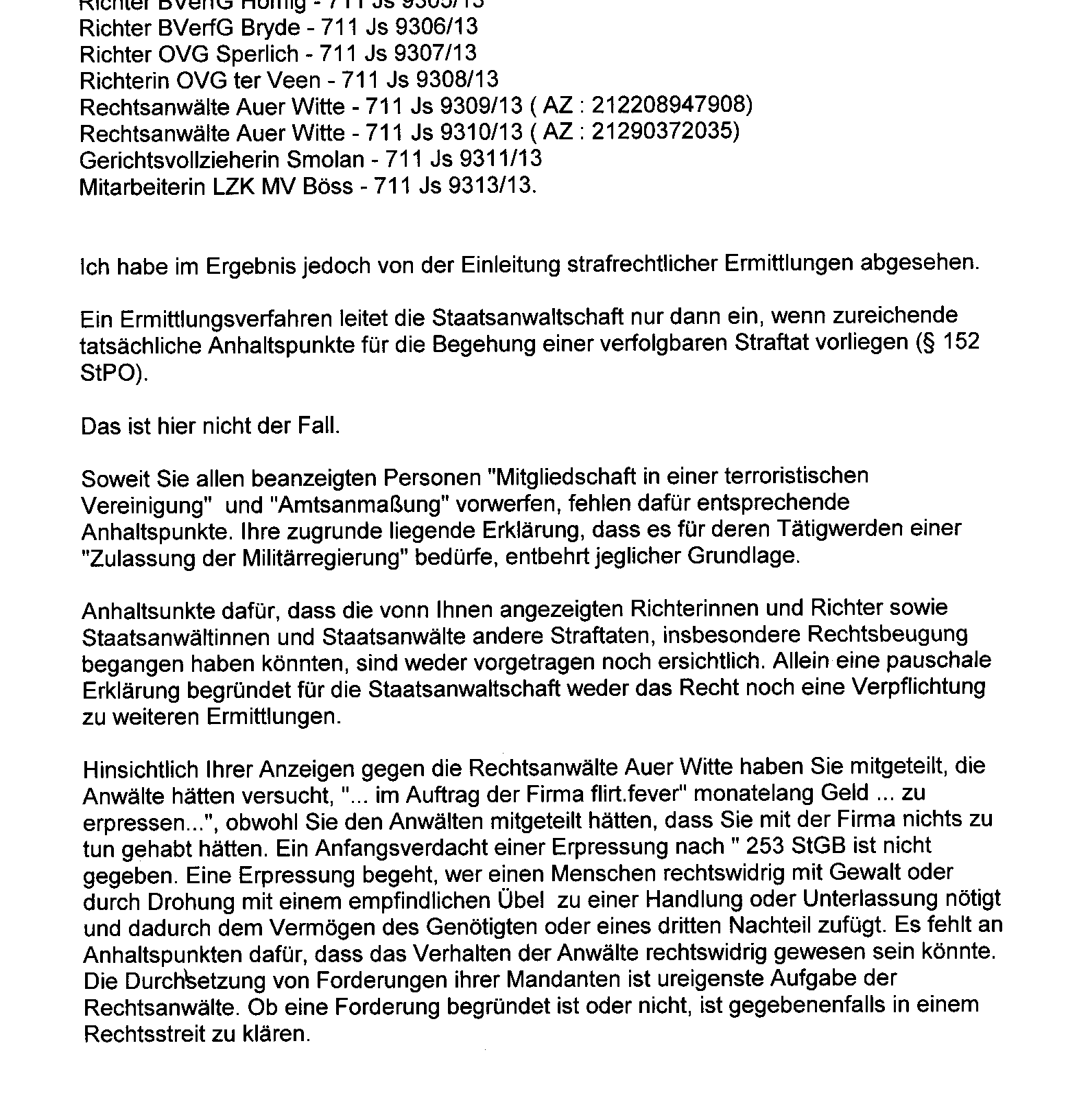 Zs 470/13). Bevor ich Ihnen die Begründung sende bitte ich zu prüfen, ob der Bescheid rechtskräftig ist. Wie ich dem Briefkopf entnehme ist er angeblich von der Generalstaatsanwaltschaft in Rostock und wurde bearbeitet von StA'in Dr. Lipsky. Aus folgenden Gründen zweifle ich an der Rechtmäßigkeit des Bescheids.