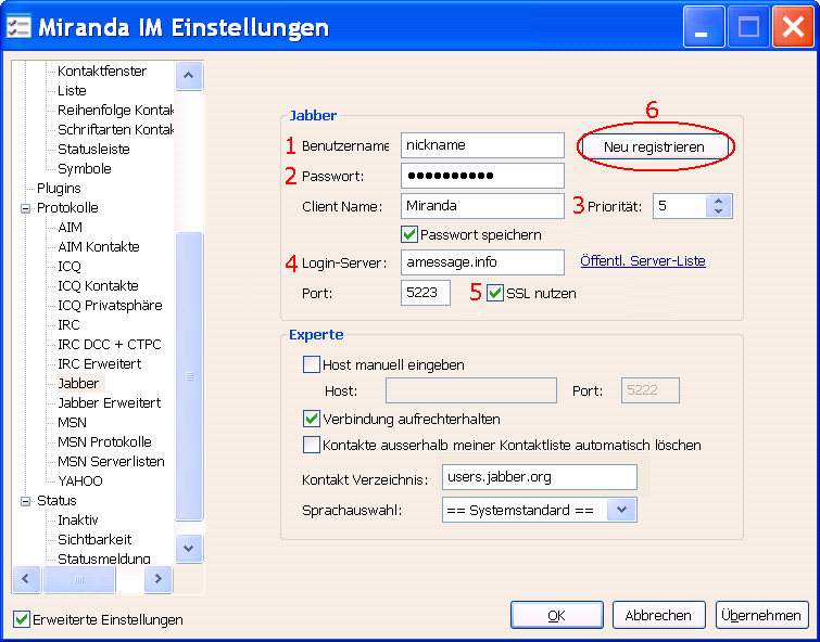 Die unten gezeigten Bilder geben nicht den aktuellen Stand wieder, bitte schaue dir die Anleitung im Miranda IM Wiki an.