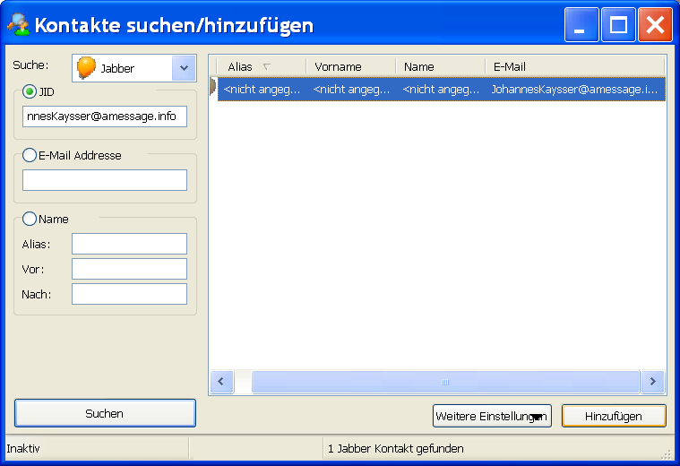 In dem sich öffnenden Fenster kannst Du dann nach allen möglichen Kriterien suchen lassen oder, wenn Du die Jabber ID schon kennst, diese einfach eingeben.