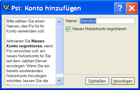 Als nächstes setze bitte einen Haken bei "Neues Nutzerkonto registrieren" und klicke auf Hinzufügen.