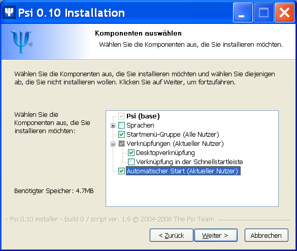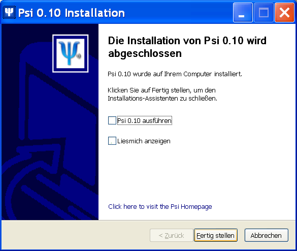 Bitte entferne die beiden Haken – vor dem Starten von Psi werden noch Dateien installiert und die LiesMich-Datei ist, abgesehen davon, dass sie auf Englisch ist, relativ uninteressant.