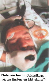 Menschenrechtler lehnen den Elektroschock (als Folter) ab. Ein Stromstoß mit der Stärke von 100 Watt, kann eine Glühbirne hell erstrahlen lassen. Die Quälerei ist nur unter Narkose erträglich. Es ist, als wenn ein Blitz in einen Computer einschlägt: Die elektrischen Elemente und Schaltkreise werden zerstört! Ähnlich wirken sich Stromstöße auf die Neuronen (Hirnzellen) aus. Die (natürlichen) elektrischen Impulse (Axonreflex), die durch die Dendriten (zellleibnah verzweigter Fortsatz) laufen und die Hirnzellen miteinander verbinden, werden elektrisch überlagert. Wieviele Synapsen (Verbindungstellen der Neuronen) dadurch im Gehirn zerstört werden, hat noch keiner gezählt.