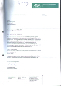 zunächst einmal bedanke ich mich für Ihr Post-Bestätigungsschreiben vom 05.02.2009, in dem Sie mitteilen, dass Frau Dr. Kirsten Reinhard, Mitglied der Arbeitsgruppe 9 "Depression", nicht mehr bei Ihnen tätig ist. Ihren Wahlspruch: "Für Ihre Gesundheit machen wir uns stark.", finde ich gut. Darf man Sie auch beim Wort nehmen und eine Frage im Interesse der Gesundheit stellen?